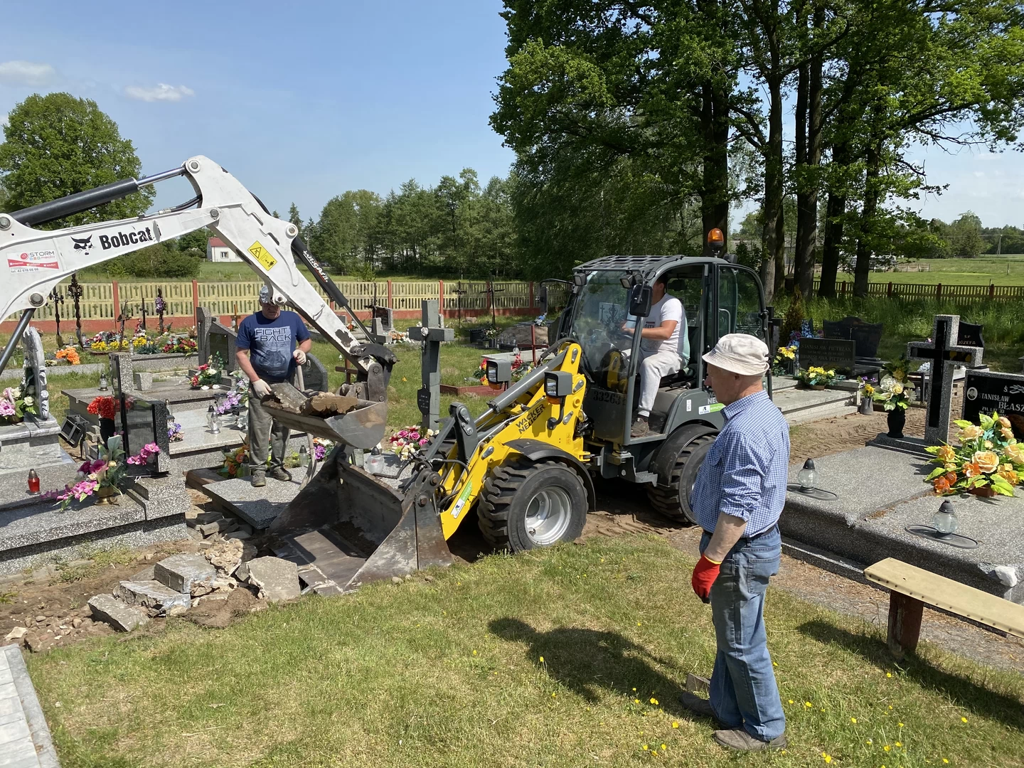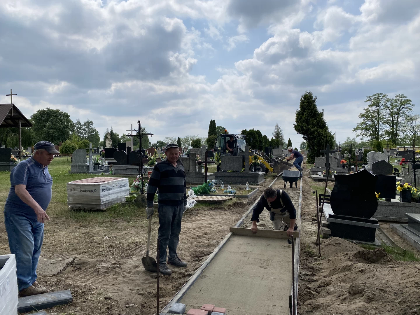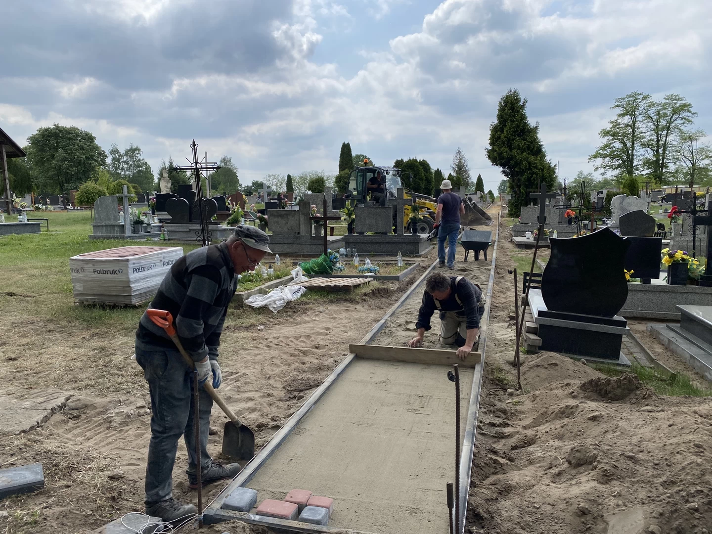 prace przy zakładaniu kostki na cmentarzu.
