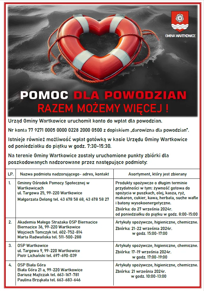 Jeśli chcesz dowiedzieć się jak wesprzeć Powodzian na południu naszego kraju, zachęcamy do zapoznania się z poniższym plakatem informacyjnym, wydanym przez Gminę Wartkowice.
